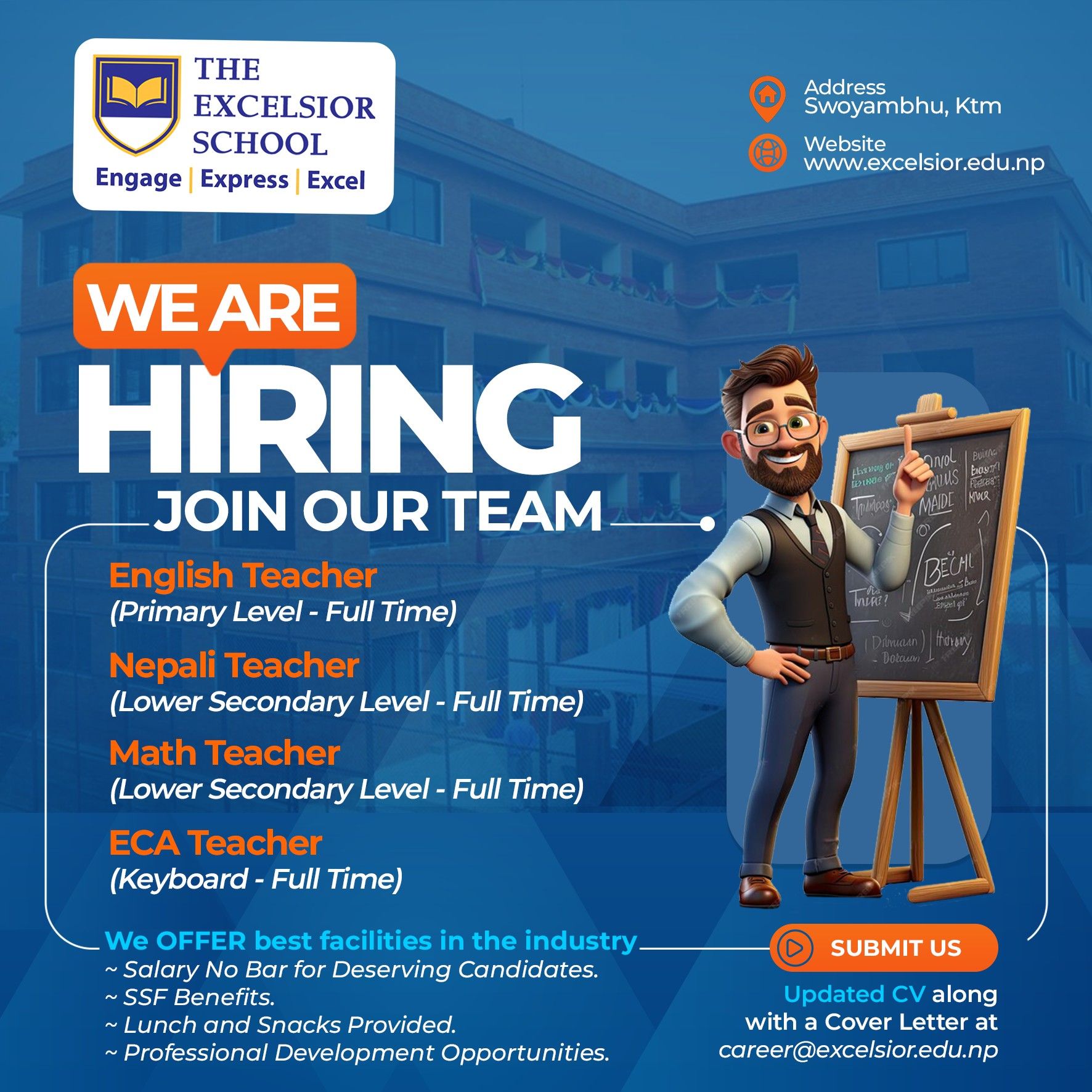 We are looking for some members to join our academic team at The Excelsior School situated at Swoyambhu, Kathmandu for various positions. We strive for developing life-long passion for learning in students and expect a teacher to be an architect of the pathway. If you think you are capable of preparing and executing educational plans to help students develop intellectually, socially, and emotionally, and develop that passion in students, please forward your 𝐮𝐩𝐝𝐚𝐭𝐞𝐝 𝐂𝐕 along with a 𝐜𝐨𝐯𝐞𝐫 𝐥𝐞𝐭𝐭𝐞𝐫 at 𝐜𝐚𝐫𝐞𝐞𝐫@𝐞𝐱𝐜𝐞𝐥𝐬𝐢𝐨𝐫.𝐞𝐝𝐮.𝐧𝐩 by clearly mentioning the post you are applying for or follow the link to apply: